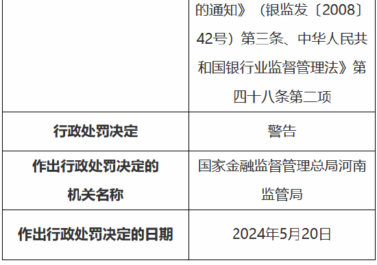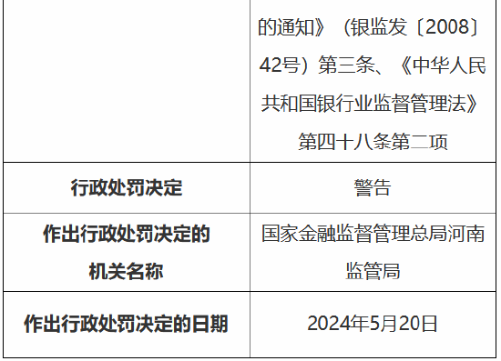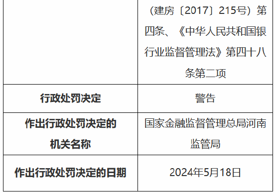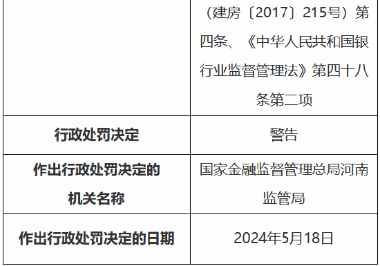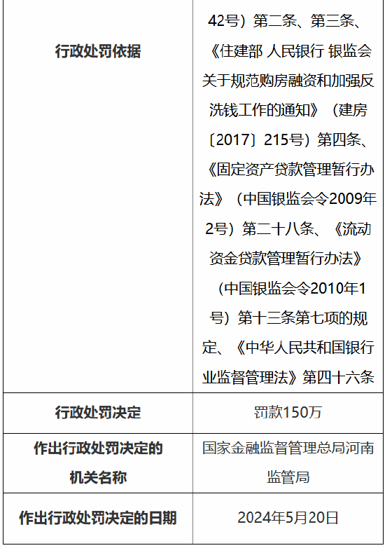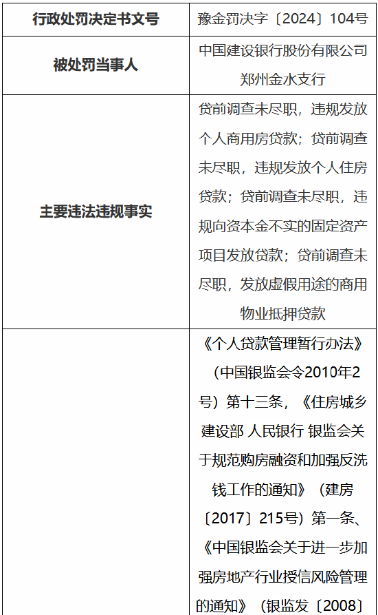 5月24日金融一线音讯,国度金融监督处分总局(河南监管局)行政处罚信息公开表知道,中国建树银行股份有限公司郑州金水支行因贷前造访未尽责,违法披发个东说念主商用房贷款;贷前造访未尽责,违法披发个东说念主住房贷款;贷前造访未尽责,违法向老本金作假的固定金钱形式披发贷款;贷前造访未尽责,披发造作用途的商用物业典质贷款,被罚金150万元。