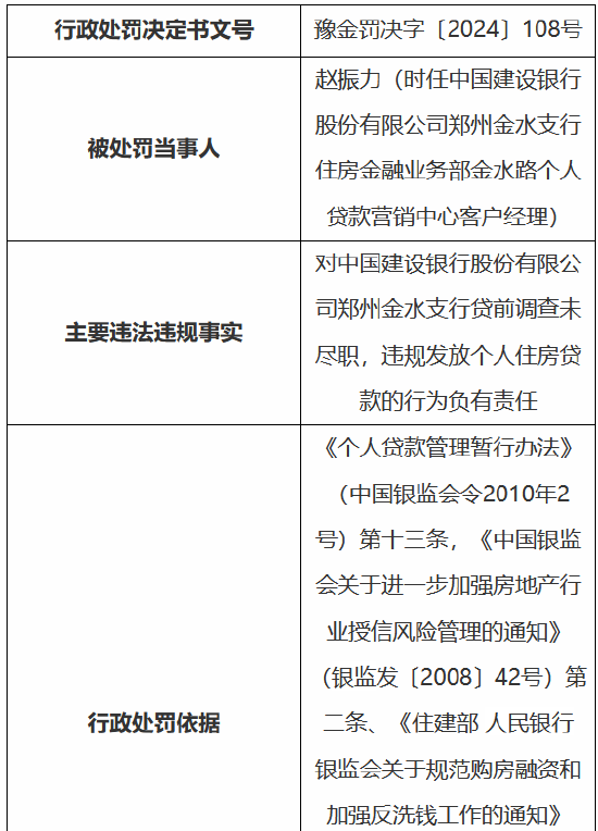 时任中国建树银行股份有限公司郑州金水支行住房金融业务部金水路个东说念主贷款营销中心客户司理赵振力,对支行贷前造访未尽责,违法披发个东说念主商用房贷款的活动负有包袱,受到指示。