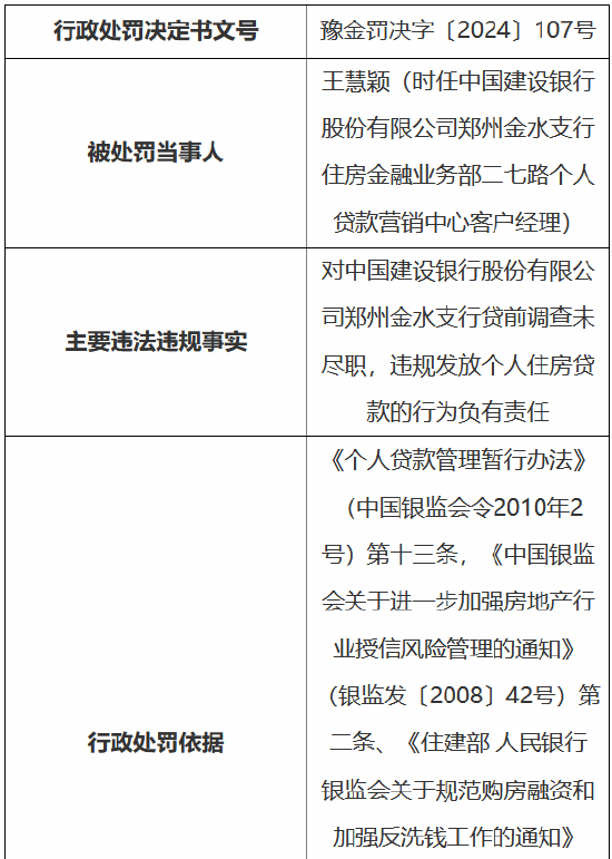 时任中国建树银行股份有限公司郑州金水支行住房金融业务部二七路个东说念主贷款营销中心客户司理王慧颖,对支行贷前造访未尽责,违法披发个东说念主商用房贷款的活动负有包袱,受到指示。
