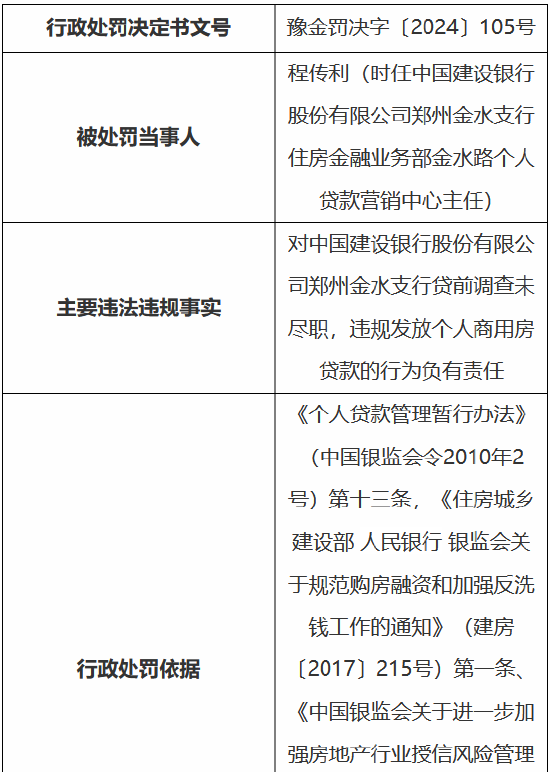时任中国建树银行股份有限公司郑州金水支行住房金融业务部金水路个东说念主贷款营销中心主任程传利,对支行贷前造访未尽责,违法披发个东说念主商用房贷款的活动负有包袱,受到指示。