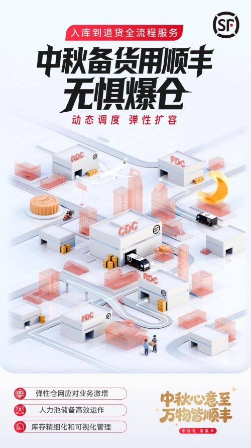 中秋旺季,仓储不仅是简便的“存货空间”,更是确保供应链顺畅、订单实时准确投递的舛错关节。为了守护节前爆仓风险,顺丰通过弹性仓网、岑岭东说念主力池储备保险高效运作,匡助商家缓慢支吾。